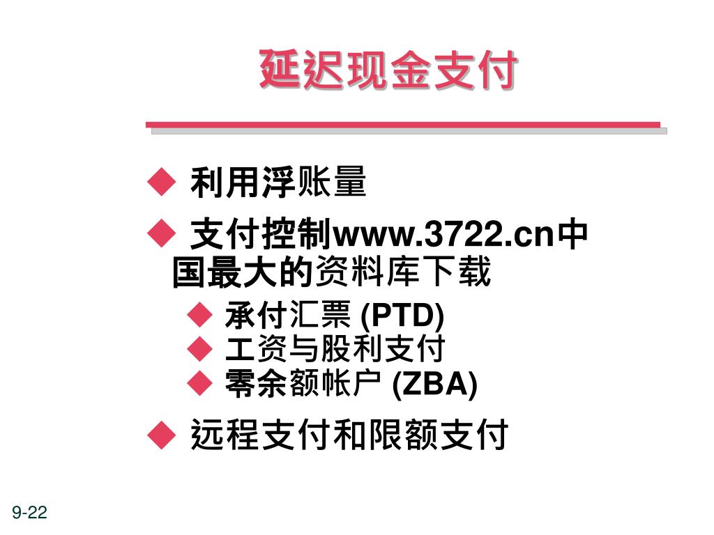 延迟现金支付 • 利用浮账量 • 支付控制www.3722.cn中国最大的资料库下载 • 承付汇票 (PTD) • 工资与股利支付 • 零余额帐户 (ZBA) • 远程支付和限额支付