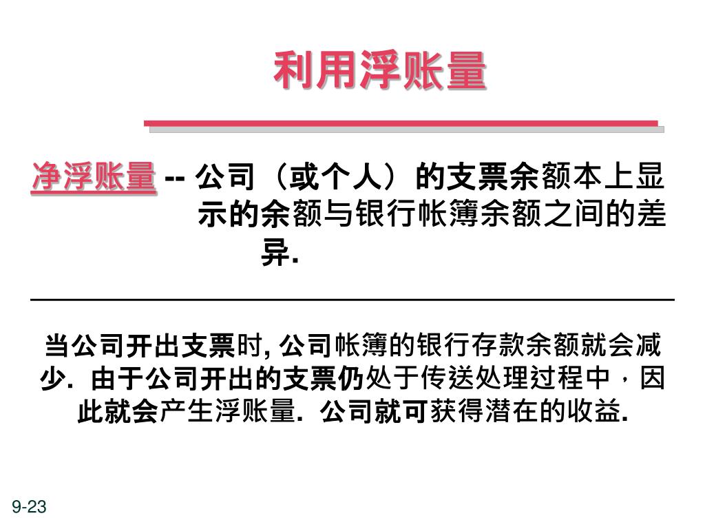 利用浮账量 当公司开出支票时, 公司帐簿的银行存款余额就会减少. 由于公司开出的支票仍处于传送处理过程中,因此就会产生浮账量. 公司就可获得潜在的收益. 净浮账量-- 公司(或个人)的支票余额本上显 示的余额与银行帐簿余额之间的差 异.
