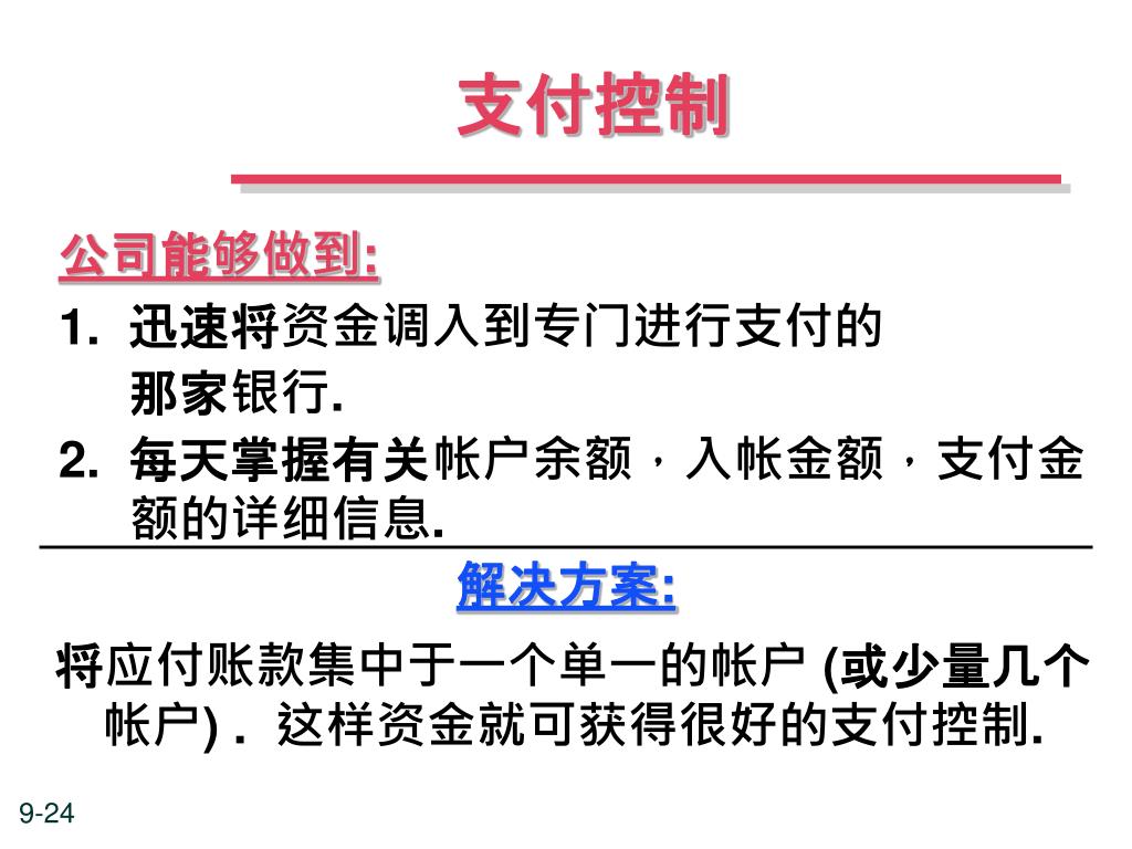 支付控制 公司能够做到: 1. 迅速将资金调入到专门进行支付的 那家银行. 2. 每天掌握有关帐户余额,入帐金额,支付金额的详细信息. 解决方案: 将应付账款集中于一个单一的帐户 (或少量几个帐户) . 这样资金就可获得很好的支付控制.