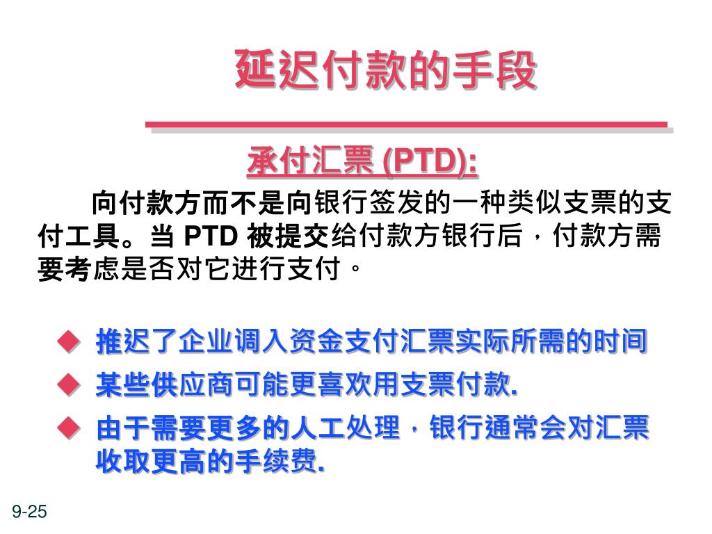 延迟付款的手段 承付汇票 (PTD): 向付款方而不是向银行签发的一种类似支票的支付工具。当 PTD 被提交给付款方银行后,付款方需要考虑是否对它进行支付。 • 推迟了企业调入资金支付汇票实际所需的时间 • 某些供应商可能更喜欢用支票付款. • 由于需要更多的人工处理,银行通常会对汇票收取更高的手续费.