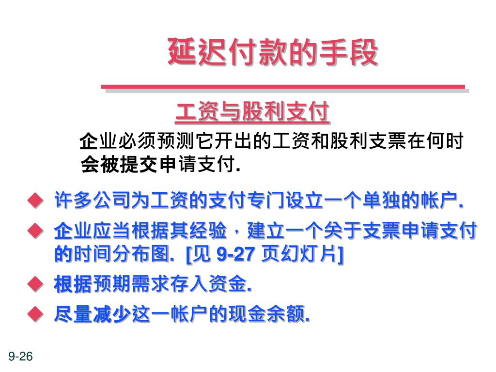 延迟付款的手段 工资与股利支付 企业必须预测它开出的工资和股利支票在何时 会被提交申请支付. • 许多公司为工资的支付专门设立一个单独的帐户. • 企业应当根据其经验,建立一个关于支票申请支付的时间分布图. [见 9-27 页幻灯片] • 根据预期需求存入资金. • 尽量减少这一帐户的现金余额.