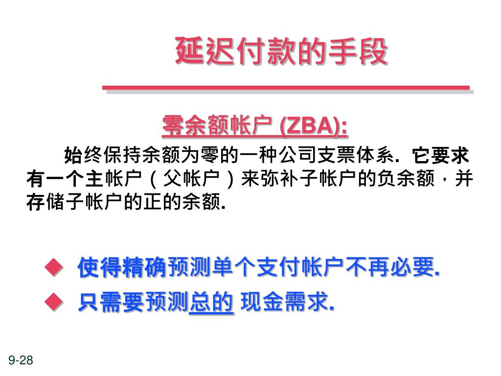 延迟付款的手段 零余额帐户 (ZBA): 始终保持余额为零的一种公司支票体系. 它要求有一个主帐户(父帐户)来弥补子帐户的负余额,并存储子帐户的正的余额. • 使得精确预测单个支付帐户不再必要. • 只需要预测总的现金需求.