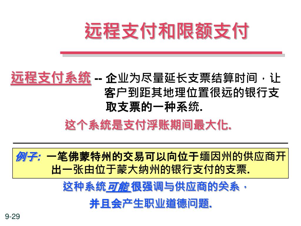 远程支付和限额支付 例子: 一笔佛蒙特州的交易可以向位于缅因州的供应商开出一张由位于蒙大纳州的银行支付的支票. 这种系统可能 很强调与供应商的关系, 并且会产生职业道德问题. 远程支付系统-- 企业为尽量延长支票结算时间,让 客户到距其地理位置很远的银行支 取支票的一种系统. 这个系统是支付浮账期间最大化.