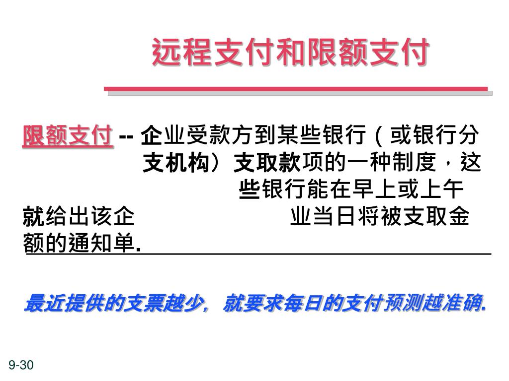 远程支付和限额支付 最近提供的支票越少,就要求每日的支付预测越准确. 限额支付-- 企业受款方到某些银行(或银行分 支机构)支取款项的一种制度,这 些银行能在早上或上午就给出该企 业当日将被支取金额的通知单.
