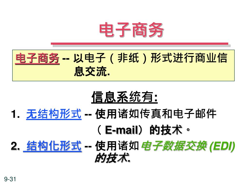 电子商务 电子商务-- 以电子(非纸)形式进行商业信 息交流. 信息系统有: 1. 无结构形式-- 使用诸如传真和电子邮件 (E-mail)的技术。 2. 结构化形式-- 使用诸如电子数据交换 (EDI) 的技术.