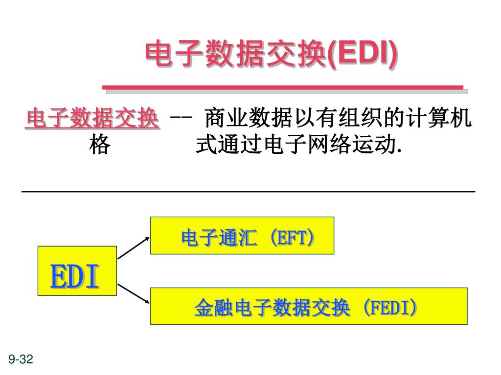 电子数据交换(EDI) 电子数据交换-- 商业数据以有组织的计算机格 式通过电子网络运动. 电子通汇 (EFT) EDI 金融电子数据交换 (FEDI)