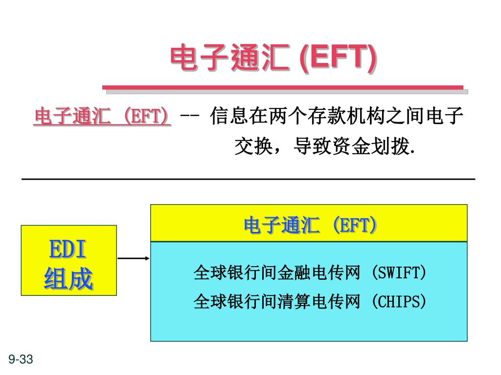 电子通汇 (EFT) 电子通汇 (EFT) -- 信息在两个存款机构之间电子 交换,导致资金划拨. 电子通汇 (EFT) EDI 组成 全球银行间金融电传网 (SWIFT) 全球银行间清算电传网 (CHIPS)