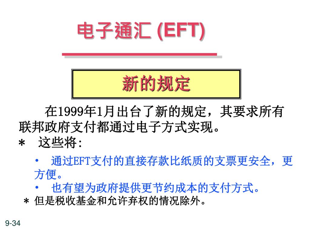 电子通汇 (EFT) 新的规定 • 在1999年1月出台了新的规定,其要求所有联邦政府支付都通过电子方式实现。 • * 这些将: • 通过EFT支付的直接存款比纸质的支票更安全,更方便。 • 也有望为政府提供更节约成本的支付方式。 • * 但是税收基金和允许弃权的情况除外。
