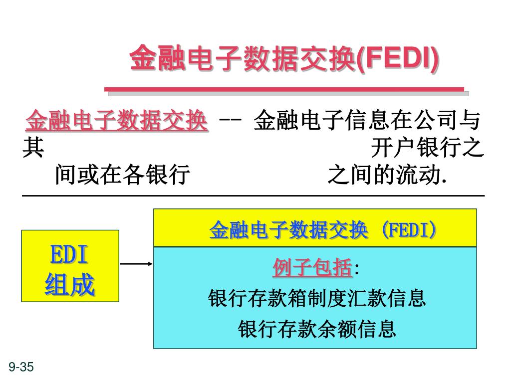 金融电子数据交换(FEDI) 金融电子数据交换-- 金融电子信息在公司与其 开户银行之间或在各银行 之间的流动. 金融电子数据交换 (FEDI) EDI 组成 例子包括: 银行存款箱制度汇款信息 银行存款余额信息