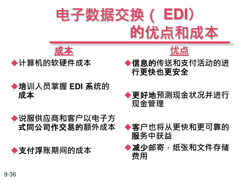 成本 计算机的软硬件成本 培训人员掌握 EDI 系统的成本 说服供应商和客户以电子方式同公司作交易的额外成本 支付浮账期间的成本 优点 信息的传送和支付活动的进行更快也更安全 更好地预测现金状况并进行现金管理 客户也将从更快和更可靠的服务中获益 减少邮寄,纸张和文件存储费用 电子数据交换( EDI) 的优点和成本
