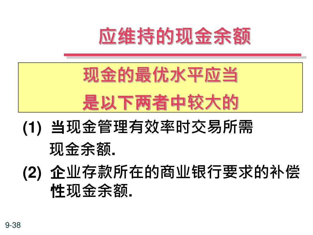 应维持的现金余额 现金的最优水平应当 是以下两者中较大的 (1) 当现金管理有效率时交易所需 现金余额. (2) 企业存款所在的商业银行要求的补偿性现金余额.