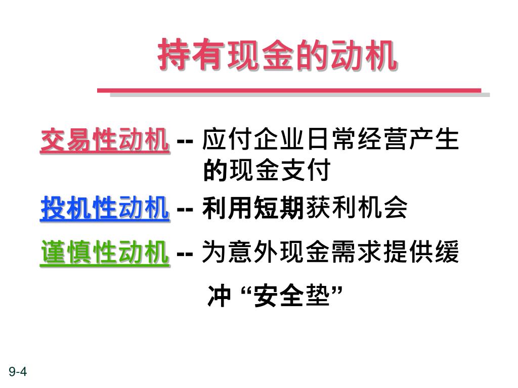 持有现金的动机 交易性动机-- 应付企业日常经营产生 的现金支付 投机性动机-- 利用短期获利机会 谨慎性动机-- 为意外现金需求提供缓 冲 “安全垫”