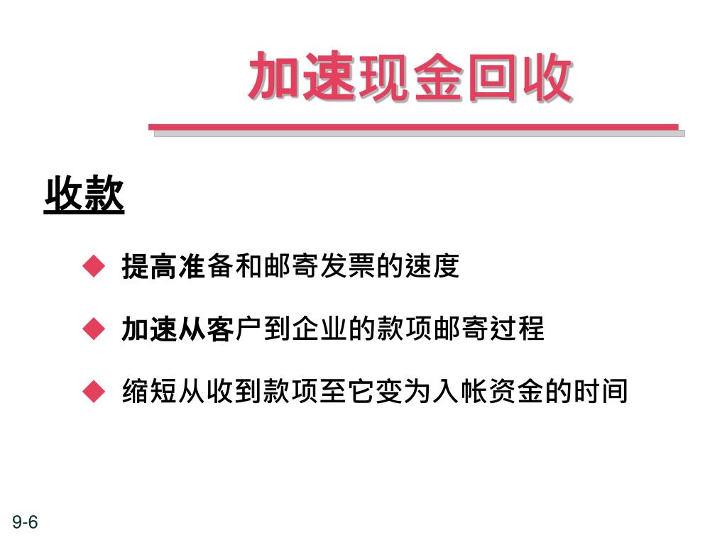 加速现金回收 收款 • 提高准备和邮寄发票的速度 • 加速从客户到企业的款项邮寄过程 • 缩短从收到款项至它变为入帐资金的时间