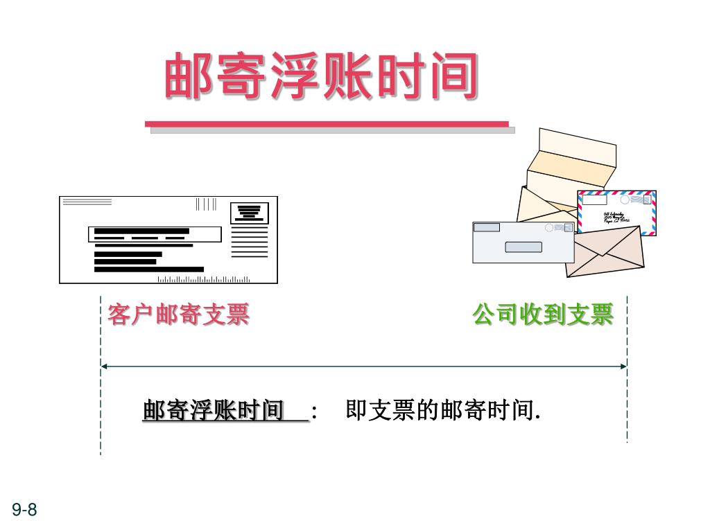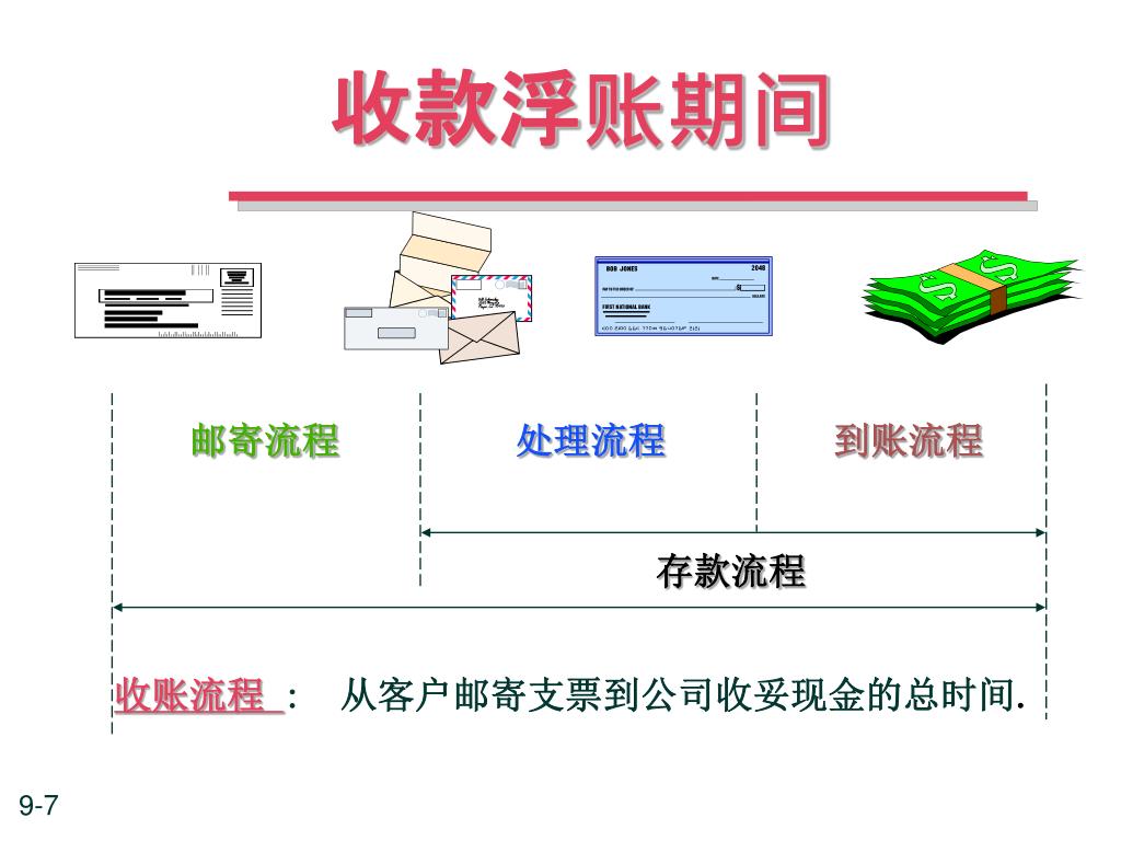收款浮账期间 邮寄流程 处理流程 到账流程 存款流程 收账流程 : 从客户邮寄支票到公司收妥现金的总时间.