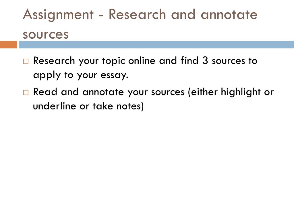 Assignment - Research and annotate sources • Research your topic online and find 3 sources to apply to your essay. • Read and annotate your sources (either highlight or underline or take notes)