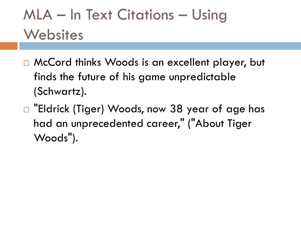MLA – In Text Citations – Using Websites • McCord thinks Woods is an excellent player, but finds the future of his game unpredictable (Schwartz). • "Eldrick (Tiger) Woods, now 38 year of age has had an unprecedented career," ("About Tiger Woods").