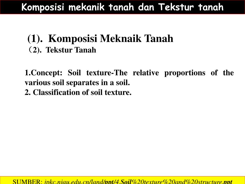 KomposisimekaniktanahdanTeksturtanah (1).KomposisiMeknaik Tanah (2). Tekstur Tanah 1.Concept: Soil texture-The relative proportions of the various soil separates in a soil. 2. Classification of soil texture. SUMBER: jpkc.njau.edu.cn/land/ppt/4.Soil%20texture%20and%20structure.ppt