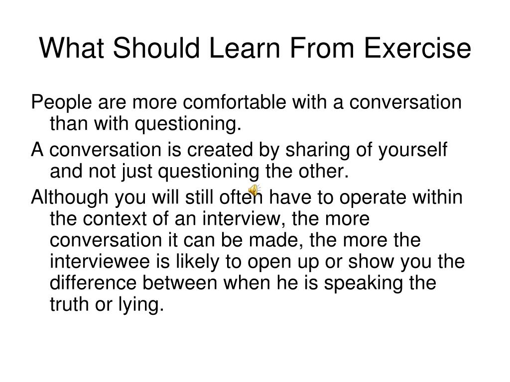 What Should Learn From Exercise People are more comfortable with a conversation than with questioning. A conversation is created by sharing of yourself and not just questioning the other. Although you will still often have to operate within the context of an interview, the more conversation it can be made, the more the interviewee is likely to open up or show you the difference between when he is speaking the truth or lying.