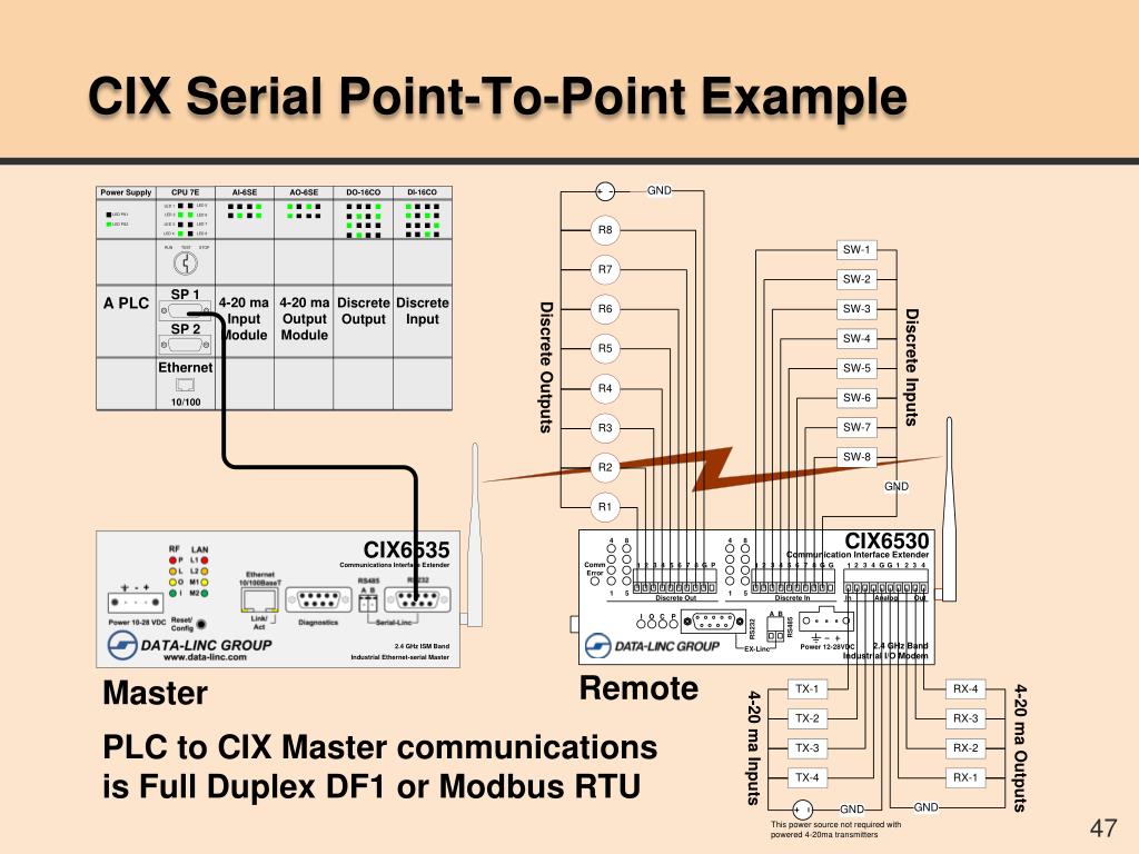 CIX Communications Master Networks • Master and Remotes are different products • Remotes (max): 16 • Network wide maximum I/O points: • 128 discrete inputs • 128 discrete outputs • 64 analog inputs • 64 analog outputs