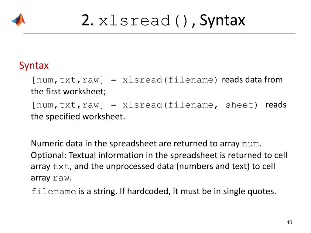 2. xlsread(), Syntax Syntax [num,txt,raw] = xlsread(filename) reads data from the first worksheet; [num,txt,raw] = xlsread(filename, sheet) reads the specified worksheet. Numeric data in the spreadsheet are returned to array num. Optional: Textual information in the spreadsheet is returned to cell array txt, and the unprocessed data (numbers and text) to cell array raw. filename is a string. If hardcoded, it must be in single quotes.