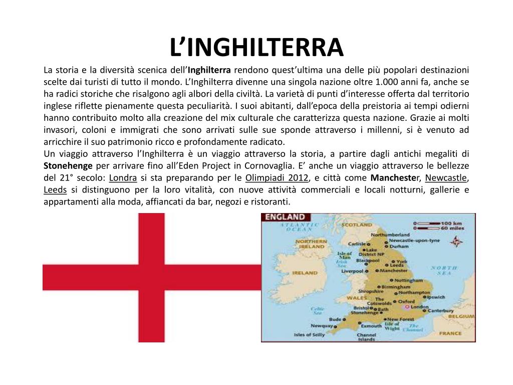 L’INGHILTERRALa storia e la diversità scenica dell’Inghilterra rendono quest’ultima una delle più popolari destinazioni scelte dai turisti di tutto il mondo. L’Inghilterra divenne una singola nazione oltre 1.000 anni fa, anche se ha radici storiche che risalgono agli albori della civiltà. La varietà di punti d’interesse offerta dal territorio inglese riflette pienamente questa peculiarità. I suoi abitanti, dall’epoca della preistoria ai tempi odierni hanno contribuito molto alla creazione del mix culturale che caratterizza questa nazione. Grazie ai molti invasori, coloni e immigrati che sono arrivati sulle sue sponde attraverso i millenni, si è venuto ad arricchire il suo patrimonio ricco e profondamente radicato. Un viaggio attraverso l’Inghilterra è un viaggio attraverso la storia, a partire dagli antichi megaliti di Stonehenge per arrivare fino all’Eden Project in Cornovaglia. E’ anche un viaggio attraverso le bellezze del 21° secolo: Londra si sta preparando per le Olimpiadi 2012, e città come Manchester, Newcastle, Leeds si distinguono per la loro vitalità, con nuove attività commerciali e locali notturni, gallerie e appartamenti alla moda, affiancati da bar, negozi e ristoranti.