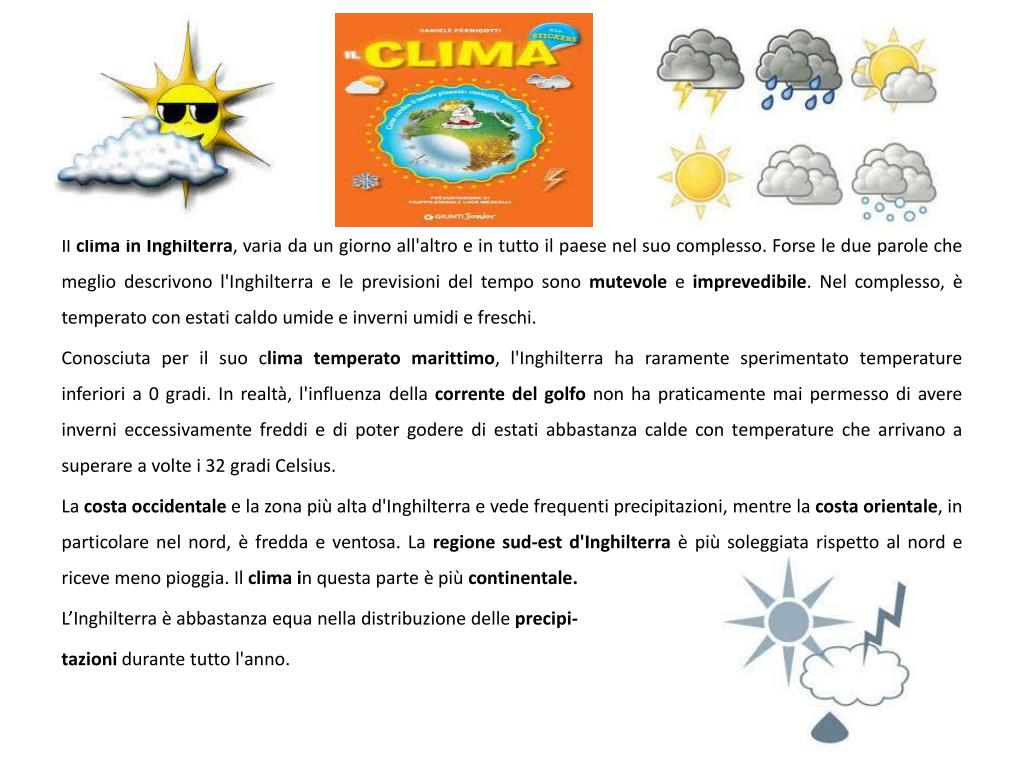 Il clima in Inghilterra, varia da un giorno all'altro e in tutto il paese nel suo complesso. Forse le due parole che meglio descrivono l'Inghilterra e le previsioni del tempo sono mutevole e imprevedibile. Nel complesso, è temperato con estati caldo umide e inverni umidi e freschi. Conosciuta per il suo clima temperato marittimo, l'Inghilterra ha raramente sperimentato temperature inferiori a 0 gradi. In realtà, l'influenza della corrente del golfo non ha praticamente mai permesso di avere inverni eccessivamente freddi e di poter godere di estati abbastanza calde con temperature che arrivano a superare a volte i 32 gradi Celsius. La costa occidentale e la zona più alta d'Inghilterra e vede frequenti precipitazioni, mentre la costa orientale, in particolare nel nord, è fredda e ventosa. La regione sud-est d'Inghilterra è più soleggiata rispetto al nord e riceve meno pioggia. Il clima in questa parte è più continentale. L’Inghilterra è abbastanza equa nella distribuzione delleprecipi- tazionidurante tutto l'anno.