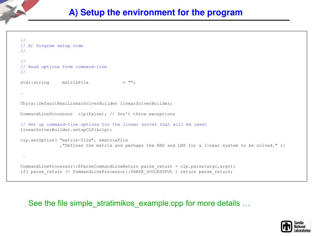 A) Setup the environment for the program // // A) Program setup code // // // Read options from command-line // std::string matrixFile = ""; … Thyra::DefaultRealLinearSolverBuilder linearSolverBuilder; CommandLineProcessor clp(false); // Don't throw exceptions // Set up command-line options for the linear solver that will be used! linearSolverBuilder.setupCLP(&clp); clp.setOption( "matrix-file", &matrixFile ,"Defines the matrix and perhaps the RHS and LHS for a linear system to be solved." ); … CommandLineProcessor::EParseCommandLineReturn parse_return = clp.parse(argc,argv); if( parse_return != CommandLineProcessor::PARSE_SUCCESSFUL ) return parse_return; See the file simple_stratimikos_example.cpp for more details …