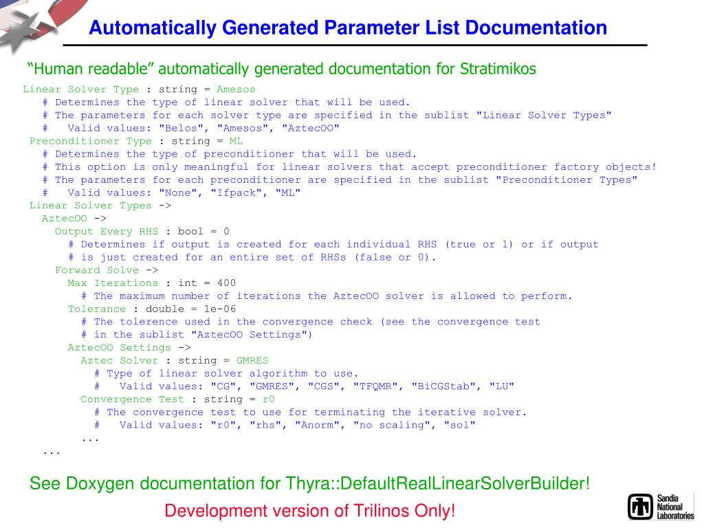 Automatically Generated Parameter List Documentation “Human readable” automatically generated documentation for Stratimikos Linear Solver Type : string = Amesos # Determines the type of linear solver that will be used. # The parameters for each solver type are specified in the sublist "Linear Solver Types" # Valid values: "Belos", "Amesos", "AztecOO" Preconditioner Type : string = ML # Determines the type of preconditioner that will be used. # This option is only meaningful for linear solvers that accept preconditioner factory objects! # The parameters for each preconditioner are specified in the sublist "Preconditioner Types" # Valid values: "None", "Ifpack", "ML" Linear Solver Types -> AztecOO -> Output Every RHS : bool = 0 # Determines if output is created for each individual RHS (true or 1) or if output # is just created for an entire set of RHSs (false or 0). Forward Solve -> Max Iterations : int = 400 # The maximum number of iterations the AztecOO solver is allowed to perform. Tolerance : double = 1e-06 # The tolerence used in the convergence check (see the convergence test # in the sublist "AztecOO Settings") AztecOO Settings -> Aztec Solver : string = GMRES # Type of linear solver algorithm to use. # Valid values: "CG", "GMRES", "CGS", "TFQMR", "BiCGStab", "LU" Convergence Test : string = r0 # The convergence test to use for terminating the iterative solver. # Valid values: "r0", "rhs", "Anorm", "no scaling", "sol" ... ... See Doxygen documentation for Thyra::DefaultRealLinearSolverBuilder! Development version of Trilinos Only!