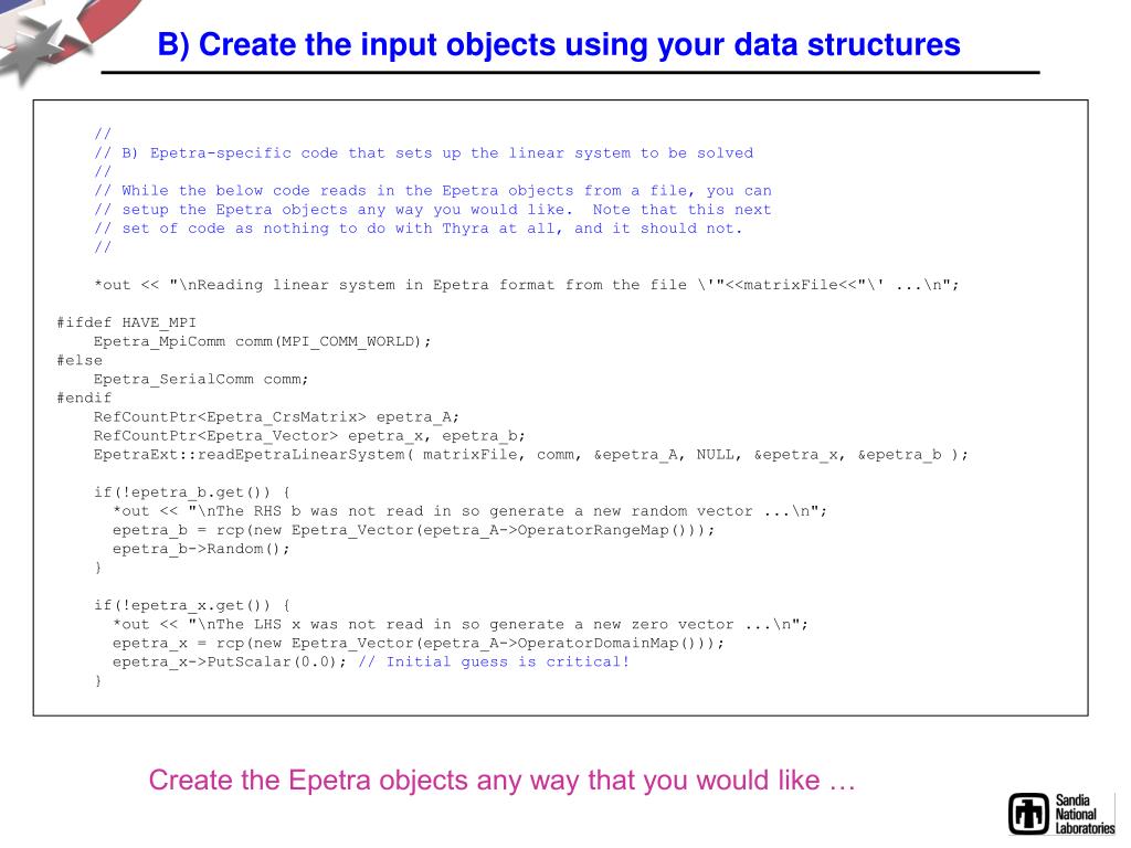 B) Create the input objects using your data structures // // B) Epetra-specific code that sets up the linear system to be solved // // While the below code reads in the Epetra objects from a file, you can // setup the Epetra objects any way you would like. Note that this next // set of code as nothing to do with Thyra at all, and it should not. // *out << "\nReading linear system in Epetra format from the file \'"<<matrixFile<<"\' ...\n"; #ifdef HAVE_MPI Epetra_MpiComm comm(MPI_COMM_WORLD); #else Epetra_SerialComm comm; #endif RefCountPtr<Epetra_CrsMatrix> epetra_A; RefCountPtr<Epetra_Vector> epetra_x, epetra_b; EpetraExt::readEpetraLinearSystem( matrixFile, comm, &epetra_A, NULL, &epetra_x, &epetra_b ); if(!epetra_b.get()) { *out << "\nThe RHS b was not read in so generate a new random vector ...\n"; epetra_b = rcp(new Epetra_Vector(epetra_A->OperatorRangeMap())); epetra_b->Random(); } if(!epetra_x.get()) { *out << "\nThe LHS x was not read in so generate a new zero vector ...\n"; epetra_x = rcp(new Epetra_Vector(epetra_A->OperatorDomainMap())); epetra_x->PutScalar(0.0); // Initial guess is critical! } Create the Epetra objects any way that you would like …