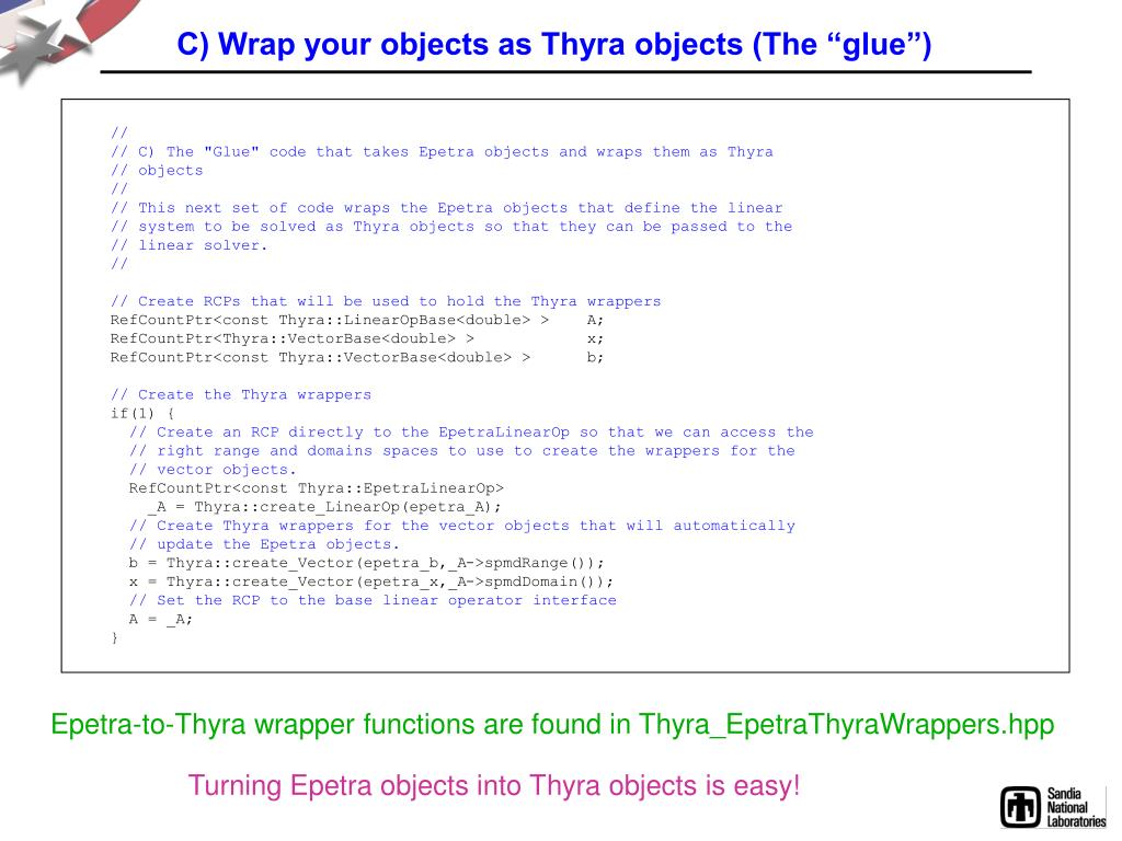 C) Wrap your objects as Thyra objects (The “glue”) // // C) The "Glue" code that takes Epetra objects and wraps them as Thyra // objects // // This next set of code wraps the Epetra objects that define the linear // system to be solved as Thyra objects so that they can be passed to the // linear solver. // // Create RCPs that will be used to hold the Thyra wrappers RefCountPtr<const Thyra::LinearOpBase<double> > A; RefCountPtr<Thyra::VectorBase<double> > x; RefCountPtr<const Thyra::VectorBase<double> > b; // Create the Thyra wrappers if(1) { // Create an RCP directly to the EpetraLinearOp so that we can access the // right range and domains spaces to use to create the wrappers for the // vector objects. RefCountPtr<const Thyra::EpetraLinearOp> _A = Thyra::create_LinearOp(epetra_A); // Create Thyra wrappers for the vector objects that will automatically // update the Epetra objects. b = Thyra::create_Vector(epetra_b,_A->spmdRange()); x = Thyra::create_Vector(epetra_x,_A->spmdDomain()); // Set the RCP to the base linear operator interface A = _A; } Epetra-to-Thyra wrapper functions are found in Thyra_EpetraThyraWrappers.hpp Turning Epetra objects into Thyra objects is easy!