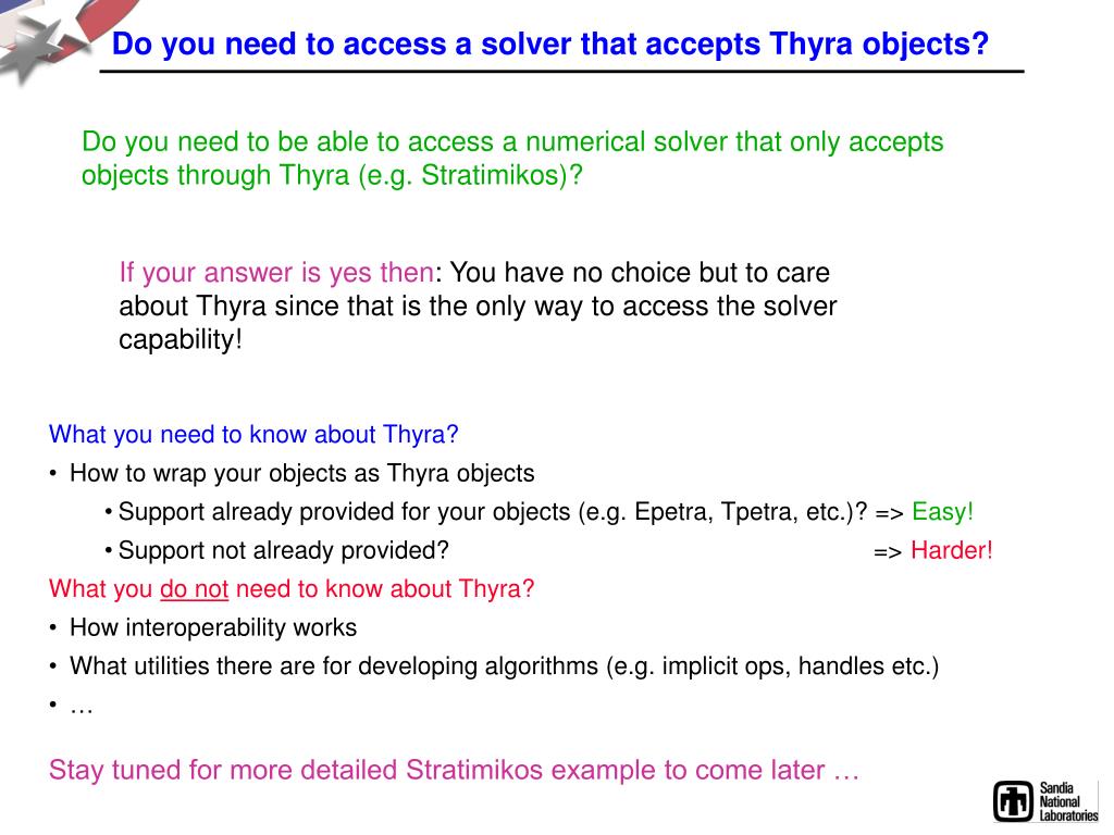 Do you need to access a solver that accepts Thyra objects? Do you need to be able to access a numerical solver that only accepts objects through Thyra (e.g. Stratimikos)? If your answer is yes then: You have no choice but to care about Thyra since that is the only way to access the solver capability! What you need to know about Thyra? • How to wrap your objects as Thyra objects • Support already provided for your objects (e.g. Epetra, Tpetra, etc.)? => Easy! • Support not already provided? => Harder! What you do not need to know about Thyra? • How interoperability works • What utilities there are for developing algorithms (e.g. implicit ops, handles etc.) • … Stay tuned for more detailed Stratimikos example to come later …