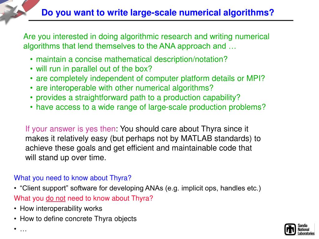 Do you want to write large-scale numerical algorithms? Are you interested in doing algorithmic research and writing numerical algorithms that lend themselves to the ANA approach and … • maintain a concise mathematical description/notation? • will run in parallel out of the box? • are completely independent of computer platform details or MPI? • are interoperable with other numerical algorithms? • provides a straightforward path to a production capability? • have access to a wide range of large-scale production problems? If your answer is yes then: You should care about Thyra since it makes it relatively easy (but perhaps not by MATLAB standards) to achieve these goals and get efficient and maintainable code that will stand up over time. What you need to know about Thyra? • “Client support” software for developing ANAs (e.g. implicit ops, handles etc.) What you do not need to know about Thyra? • How interoperability works • How to define concrete Thyra objects • …