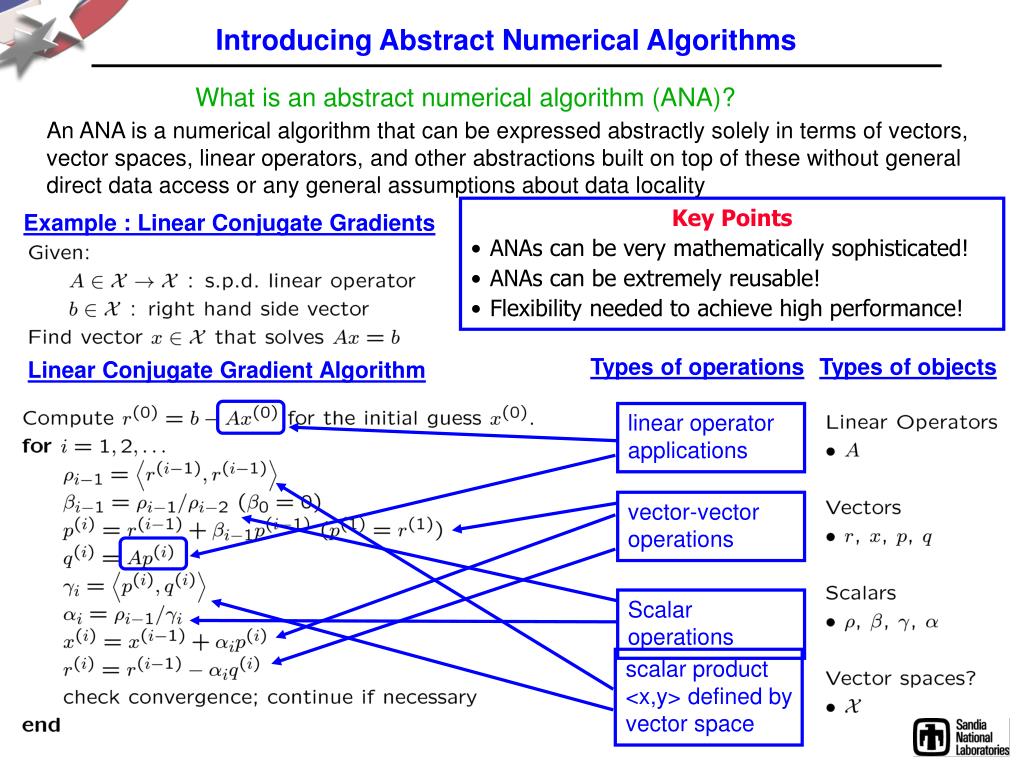 Introducing Abstract Numerical Algorithms linear operator applications vector-vector operations Scalar operations scalar product <x,y> defined by vector space What is an abstract numerical algorithm (ANA)? An ANA is a numerical algorithm that can be expressed abstractly solely in terms of vectors, vector spaces, linear operators, and other abstractions built on top of these without general direct data access or any general assumptions about data locality Key Points • ANAs can be very mathematically sophisticated! • ANAs can be extremely reusable! • Flexibility needed to achieve high performance! Example : Linear Conjugate Gradients Types of operations Types of objects Linear Conjugate Gradient Algorithm