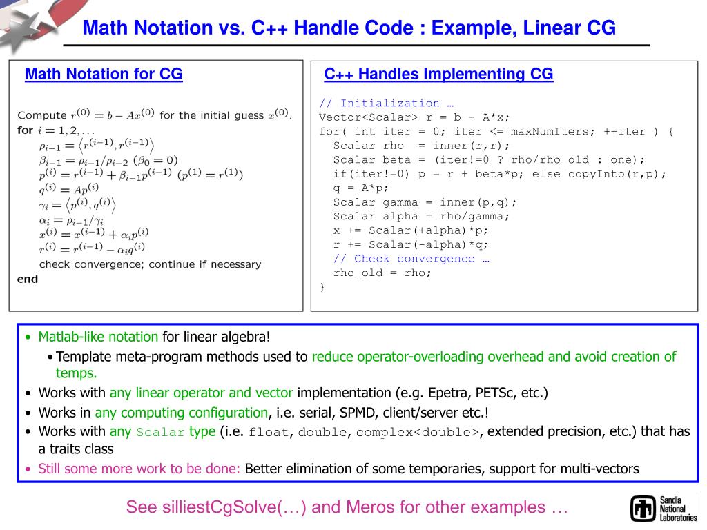 Math Notation vs. C++ Handle Code : Example, Linear CG Math Notation for CG C++ Handles Implementing CG // Initialization … Vector<Scalar> r = b - A*x; for( int iter = 0; iter <= maxNumIters; ++iter ) { Scalar rho = inner(r,r); Scalar beta = (iter!=0 ? rho/rho_old : one); if(iter!=0) p = r + beta*p; else copyInto(r,p); q = A*p; Scalar gamma = inner(p,q); Scalar alpha = rho/gamma; x += Scalar(+alpha)*p; r += Scalar(-alpha)*q; // Check convergence … rho_old = rho; } • Matlab-like notation for linear algebra! • Template meta-program methods used to reduce operator-overloading overhead and avoid creation of temps. • Works with any linear operator and vector implementation (e.g. Epetra, PETSc, etc.) • Works in any computing configuration, i.e. serial, SPMD, client/server etc.! • Works with any Scalar type (i.e. float, double, complex<double>, extended precision, etc.) that has a traits class • Still some more work to be done: Better elimination of some temporaries, support for multi-vectors See silliestCgSolve(…) and Meros for other examples …
