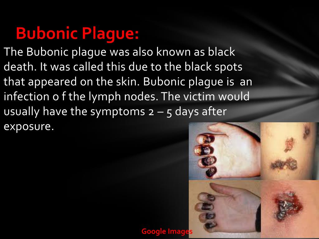 Bubonic Plague: • The Bubonic plague was also known as black death. It was called this due to the black spots that appeared on the skin. Bubonic plague is an infection o f the lymph nodes. The victim would usually have the symptoms 2 – 5 days after exposure. Google Images
