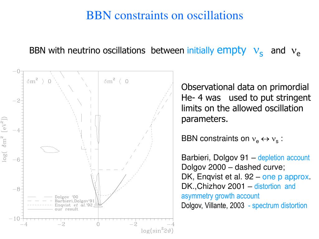 BBN constraints on oscillationsBBN with neutrino oscillations between initially empty ns and ne Observational data on primordial He- 4 was used toputstringent limitson the allowed oscillation parameters. BBN constraints on е s : Barbieri, Dolgov 91 – depletionaccount Dolgov 2000 – dashed curve; DK, Enqvist et al. 92 – one p approx. DK.,Chizhov 2001 – distortionand asymmetry growth account Dolgov, Villante, 2003 - spectrum distortion