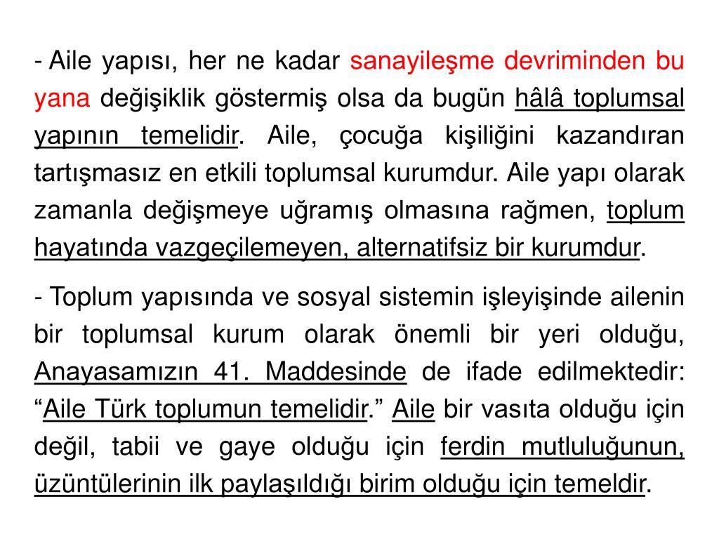 Aile yapısı, her ne kadar sanayileşme devriminden bu yana değişiklik göstermiş olsa da bugün hâlâ toplumsal yapının temelidir. Aile, çocuğa kişiliğini kazandıran tartışmasız en etkili toplumsal kurumdur. Aile yapı olarak zamanla değişmeye uğramış olmasına rağmen, toplum hayatında vazgeçilemeyen, alternatifsiz bir kurumdur. • Toplum yapısında ve sosyal sistemin işleyişinde ailenin bir toplumsal kurum olarak önemli bir yeri olduğu, Anayasamızın 41. Maddesinde de ifade edilmektedir: “Aile Türk toplumun temelidir.” Aile bir vasıta olduğu için değil, tabii ve gaye olduğu için ferdin mutluluğunun, üzüntülerinin ilk paylaşıldığı birim olduğu için temeldir.
