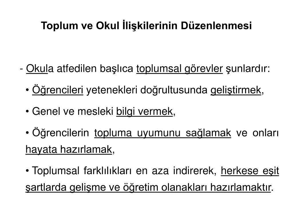 Toplum ve Okul İlişkilerinin Düzenlenmesi • - Okula atfedilen başlıca toplumsal görevler şunlardır: • Öğrencileri yetenekleri doğrultusunda geliştirmek, • Genel ve mesleki bilgi vermek, • Öğrencilerin topluma uyumunu sağlamak ve onları hayata hazırlamak, • Toplumsal farklılıkları en aza indirerek, herkese eşit şartlarda gelişme ve öğretim olanakları hazırlamaktır.