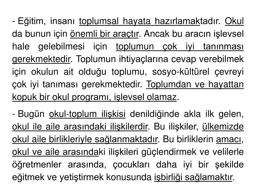 Eğitim, insanı toplumsal hayata hazırlamaktadır. Okul da bunun için önemli bir araçtır. Ancak bu aracın işlevsel hale gelebilmesi için toplumun çok iyi tanınması gerekmektedir. Toplumun ihtiyaçlarına cevap verebilmek için okulun ait olduğu toplumu, sosyo-kültürel çevreyi çok iyi tanıması gerekmektedir. Toplumdan ve hayattan kopuk bir okul programı, işlevsel olamaz. • Bugün okul-toplum ilişkisi denildiğinde akla ilk gelen, okul ile aile arasındaki ilişkilerdir. Bu ilişkiler, ülkemizde okul aile birlikleriyle sağlanmaktadır. Bu birliklerin amacı, okul ve aile arasındaki ilişkileri güçlendirmek ve velilerle öğretmenler arasında, çocukları daha iyi bir şekilde eğitmek ve yetiştirmek konusunda işbirliği sağlamaktır.