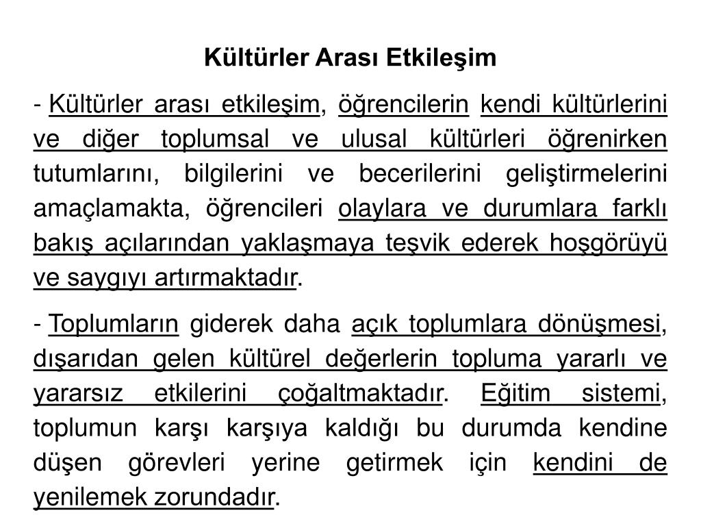 Kültürler Arası Etkileşim • Kültürler arası etkileşim, öğrencilerinkendi kültürlerini ve diğer toplumsal ve ulusal kültürleri öğrenirken tutumlarını, bilgilerini ve becerilerini geliştirmelerini amaçlamakta, öğrencileri olaylara ve durumlara farklı bakış açılarından yaklaşmaya teşvik ederek hoşgörüyü ve saygıyı artırmaktadır. • Toplumların giderek daha açık toplumlara dönüşmesi, dışarıdan gelen kültürel değerlerin topluma yararlı ve yararsız etkilerini çoğaltmaktadır. Eğitim sistemi, toplumun karşı karşıya kaldığı bu durumda kendine düşen görevleri yerine getirmek için kendini de yenilemek zorundadır.