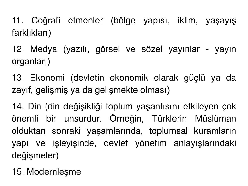 11. Coğrafi etmenler (bölge yapısı, iklim, yaşayış farklıkları) 12. Medya (yazılı, görsel ve sözel yayınlar - yayın organları) 13. Ekonomi (devletin ekonomik olarak güçlü ya da zayıf, gelişmiş ya da gelişmekte olması) 14. Din (din değişikliği toplum yaşantısını etkileyen çok önemli bir unsurdur. Örneğin, Türklerin Müslüman olduktan sonraki yaşamlarında, toplumsal kuramların yapı ve işleyişinde, devlet yönetim anlayışlarındaki değişmeler) 15. Modernleşme