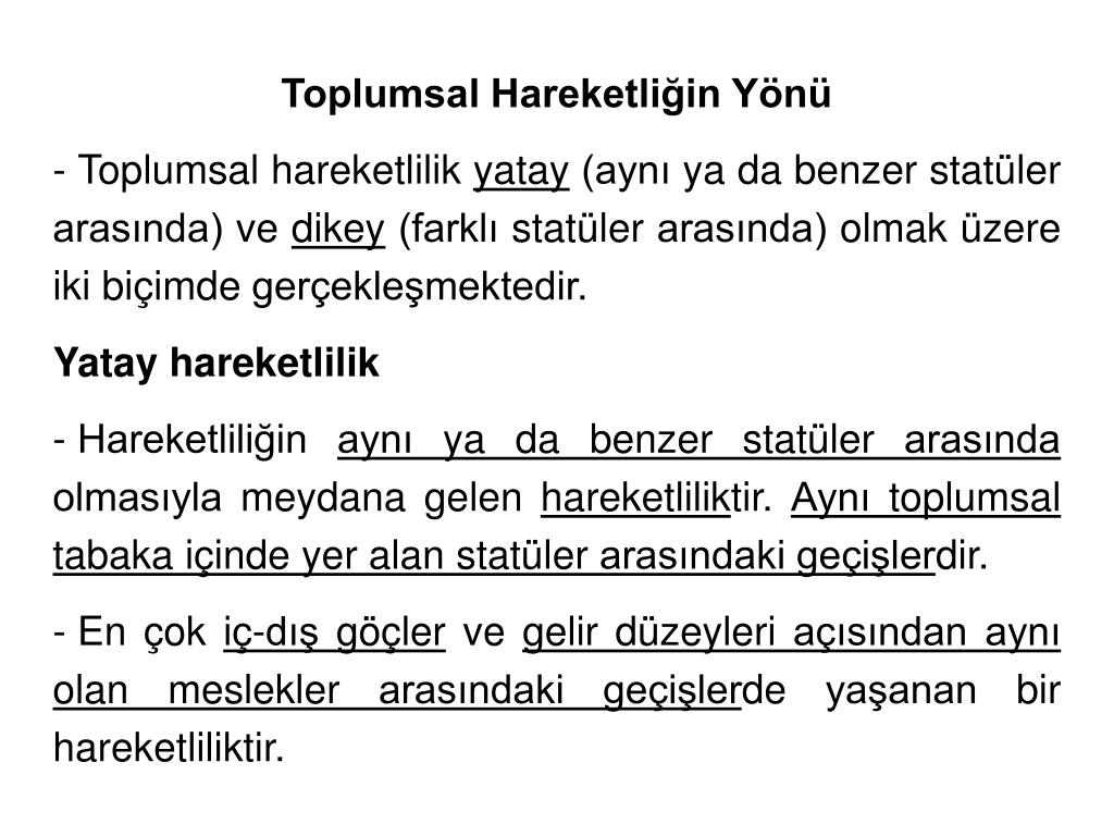 Toplumsal Hareketliğin Yönü • - Toplumsal hareketlilik yatay (aynı ya da benzer statüler arasında) ve dikey (farklı statüler arasında) olmak üzere iki biçimde gerçekleşmektedir. • Yatay hareketlilik • Hareketliliğin aynı ya da benzer statüler arasında olmasıyla meydana gelen hareketliliktir. Aynı toplumsal tabaka içinde yer alan statüler arasındaki geçişlerdir. • En çok iç-dış göçler ve gelir düzeyleri açısından aynı olan meslekler arasındaki geçişlerde yaşanan bir hareketliliktir.
