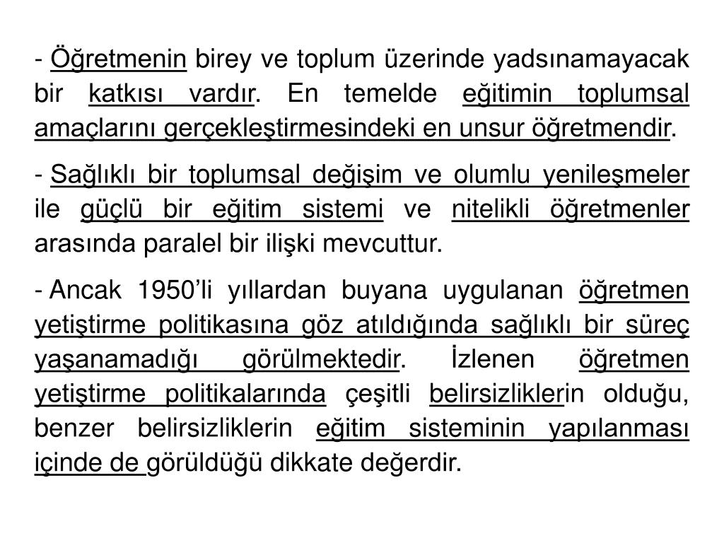 Öğretmenin birey ve toplum üzerinde yadsınamayacak bir katkısı vardır. En temelde eğitimin toplumsal amaçlarını gerçekleştirmesindeki en unsur öğretmendir. • Sağlıklı bir toplumsal değişim ve olumlu yenileşmeler ile güçlü bir eğitim sistemi ve nitelikli öğretmenler arasında paralel bir ilişki mevcuttur. • Ancak 1950’li yıllardan buyana uygulanan öğretmen yetiştirme politikasına göz atıldığında sağlıklı bir süreç yaşanamadığı görülmektedir. İzlenen öğretmen yetiştirme politikalarında çeşitli belirsizliklerin olduğu, benzer belirsizliklerin eğitim sisteminin yapılanması içinde de görüldüğü dikkate değerdir.