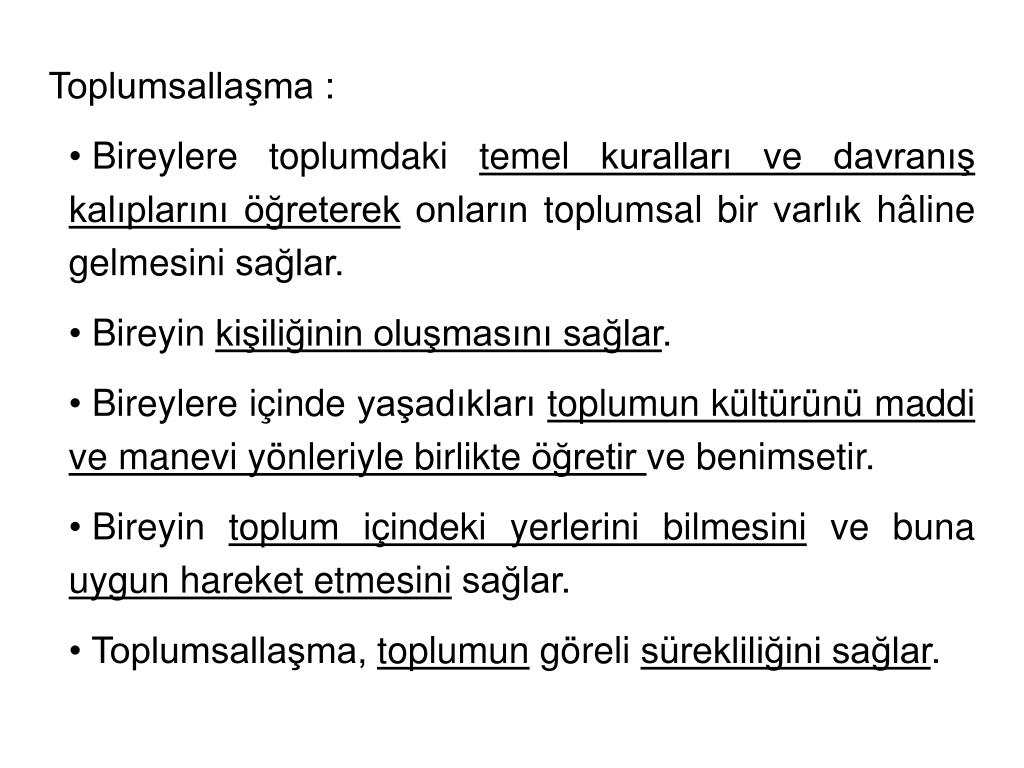 Toplumsallaşma : • Bireylere toplumdaki temel kuralları ve davranış kalıplarını öğreterek onların toplumsal bir varlık hâline gelmesini sağlar. • Bireyin kişiliğinin oluşmasını sağlar. • Bireylere içinde yaşadıkları toplumun kültürünü maddi ve manevi yönleriyle birlikte öğretir ve benimsetir. • Bireyin toplum içindeki yerlerini bilmesini ve buna uygun hareket etmesini sağlar. • Toplumsallaşma, toplumun göreli sürekliliğini sağlar.