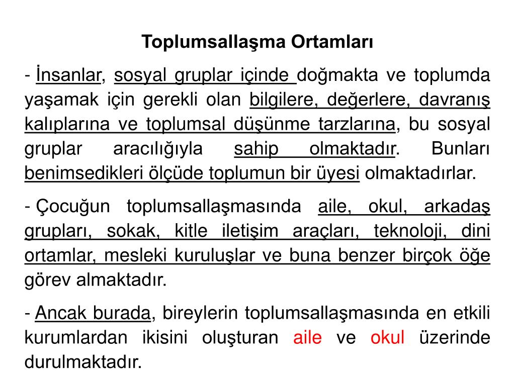 Toplumsallaşma Ortamları • İnsanlar, sosyal gruplar içinde doğmakta ve toplumda yaşamak için gerekli olan bilgilere, değerlere, davranış kalıplarına ve toplumsal düşünme tarzlarına, bu sosyal gruplar aracılığıyla sahip olmaktadır. Bunları benimsedikleri ölçüde toplumun bir üyesi olmaktadırlar. • Çocuğun toplumsallaşmasında aile, okul, arkadaş grupları, sokak, kitle iletişim araçları, teknoloji, dini ortamlar, mesleki kuruluşlar ve buna benzer birçok öğe görev almaktadır. • Ancak burada, bireylerin toplumsallaşmasında en etkili kurumlardan ikisini oluşturan aile ve okul üzerinde durulmaktadır.