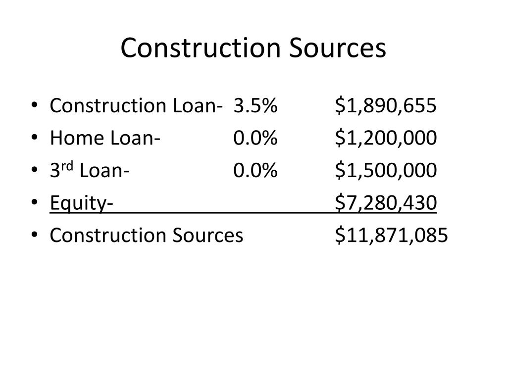 Construction Sources • Construction Loan- 3.5% $1,890,655 • Home Loan- 0.0% $1,200,000 • 3rd Loan- 0.0% $1,500,000 • Equity- $7,280,430 • Construction Sources $11,871,085