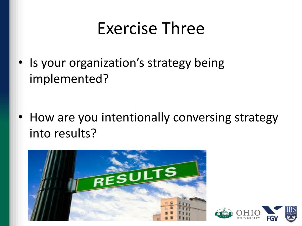 Exercise Three • Is your organization’s strategy being implemented? • How are you intentionally conversing strategy into results?