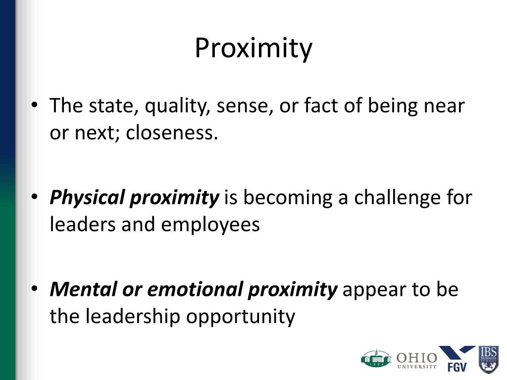 Proximity • The state, quality, sense, or fact of being near or next; closeness. • Physical proximity is becoming a challenge for leaders and employees • Mental or emotional proximity appear to be the leadership opportunity