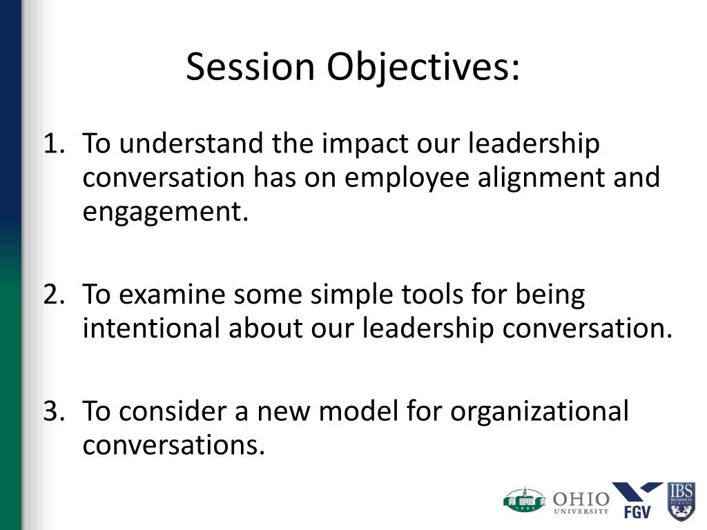 Session Objectives: • To understand the impact our leadership conversation has on employee alignment and engagement. • To examine some simple tools for being intentional about our leadership conversation. • To consider a new model for organizational conversations.