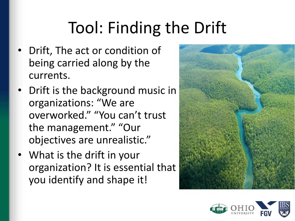 Tool: Finding the Drift • Drift, The act or condition of being carried along by the currents. • Drift is the background music in organizations: “We are overworked.” “You can’t trust the management.” “Our objectives are unrealistic.” • What is the drift in your organization? It is essential that you identify and shape it!